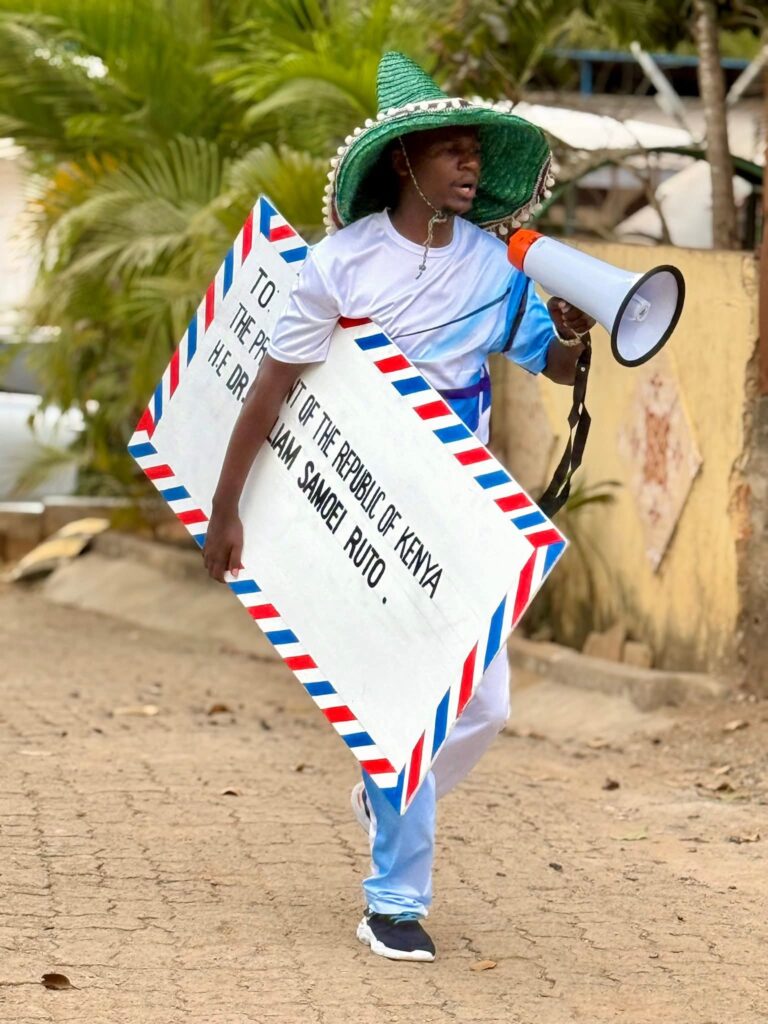 During the walk, Kaviru carried a board designed as a letter envelope branded “To the president of republic of Kenya He Dr. William Samoei Ruto”.