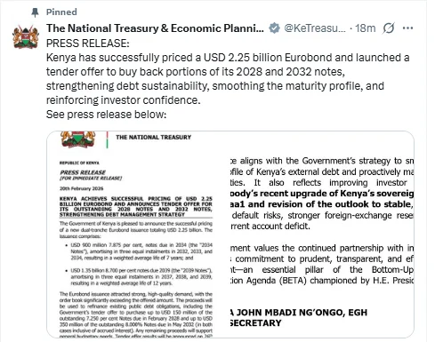 “The government of Kenya is pleased to announce the successful pricing of a new dual-tranche Eurobond issuance totalling $2.25 billion,” the statement read in part.
