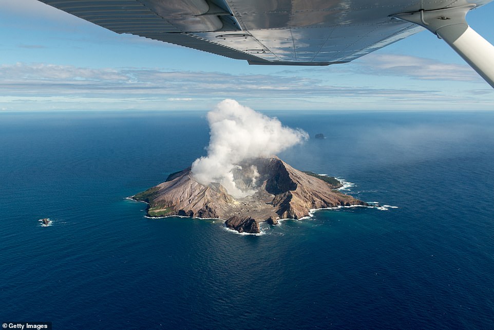 A group of tourists were pictured deep inside the crater just moments before the blast, while others on a boat touring the island were forced to run for safety as thick, black smoked billowed towards them.