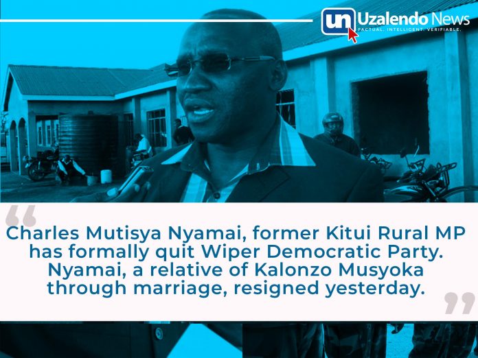 Charles Mutisya Nyamai, former Kitui Rural MP has formally quit Wiper Democratic Party. In a signed letter to the party, Nyamai withrew his life membership. – By Meshack Makau