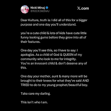 Nicki came under fire earlier this week for mocking Kulture, sparking outrage across social media. Facing mounting criticism, the rapper shared an open letter addressed to the child, expressing partial remorse. In the note, she told Kulture it wasn’t her fault she had “funny-looking gums,” but claimed Cardi was responsible for pushing her to act out of character.