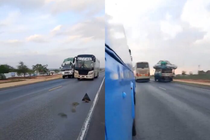 In the video, the bus is seen engaging in an overtaking race with a truck while another bus had broken down on the highway.