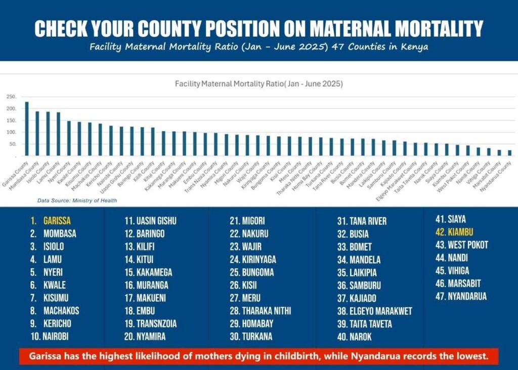 Nyandarua County has been ranked as the best-performing county in reducing maternal deaths across Kenya, according to the latest Ministry of Health Facility Maternal Mortality Report covering January to June 2025.