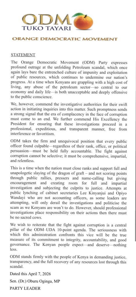 The Orange Democratic Movement (ODM) has strongly condemned the unfolding petroleum sector scandal, describing it as a reflection of a deep-rooted culture of impunity and exploitation of public resources.