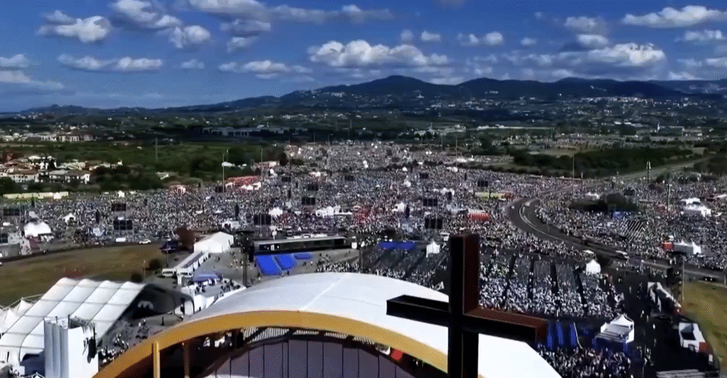 The atmosphere was described as festive and energetic, often likened to a Catholic “Woodstock,” with thousands camping out, singing, and waving flags under the bright Roman sun.