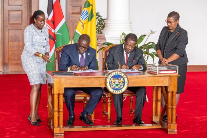 President William Ruto witnessed the appending of signatures by Nairobi Governor Johnson Sakaja and Prime Cabinet Secretary Musalia Mudavadi.