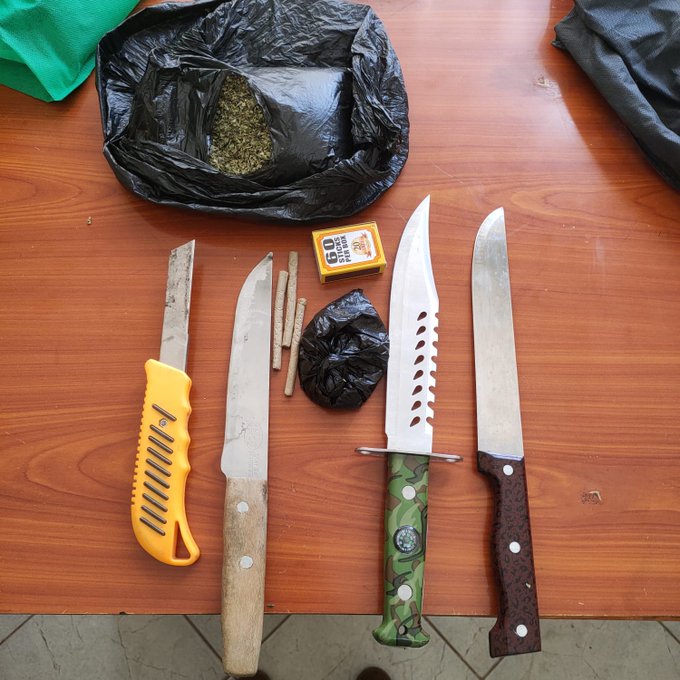 According to the National Police Service (NPS), the suspects were found in possession of 4 knives, one stone, and 8 rolls of bhang.