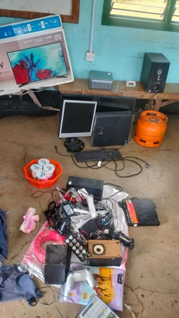 Among the recovered goods were a 32-inch Samsung TV, a computer set (CPU, monitor, and keyboard), an RG-brand woofer, an Optima projector, a DVD player, two Nikon cameras, and three rolls of electric cable. Also found were assorted electrical shop accessories and a 6kg Meko gas cylinder.