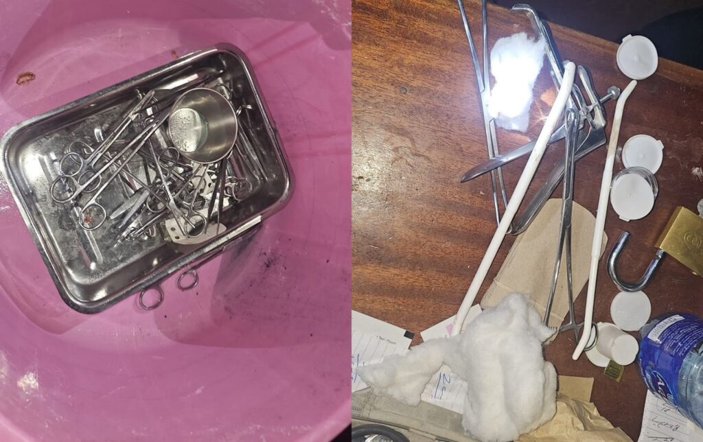 At the clinic, officers found Muthuri operating without registration, with a search uncovering assorted drugs and surgical tools, some stained with fresh blood.