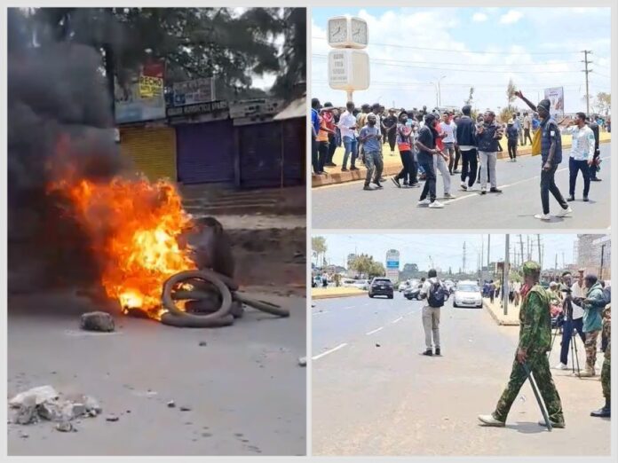 Burning tyres and rocks were seen on the road near the Roysambu roundabout as police struggled to restore order.