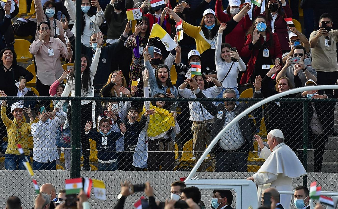 The pontiff was greeted by thousands in a sports stadium in the Kurdistan region’s capital Arbil who had gathered despite fears the event could become a Covid-19 “super-spreader”.