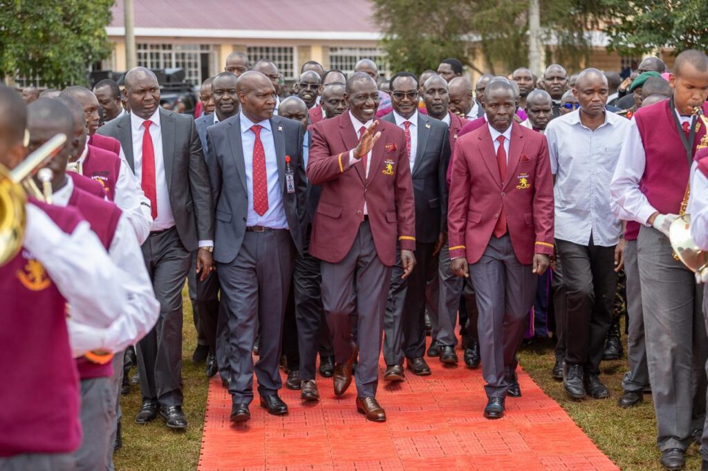 Ruto was dressed in a white shirt, red tie and maroon blazer during the school’s Centenary celebrations, marking 100 years of its existence.