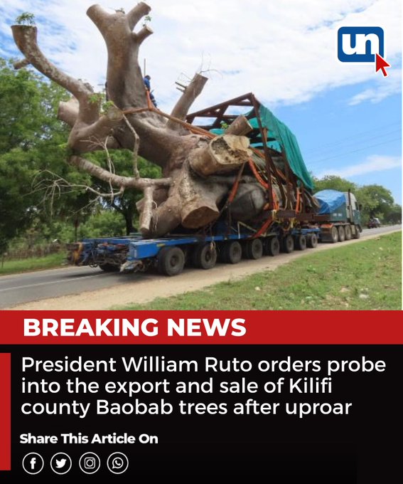 President William Ruto has directed the Ministry of Environment and Forestry to conduct an investigation into the ongoing uprooting of Baobab trees in Kilifi county.