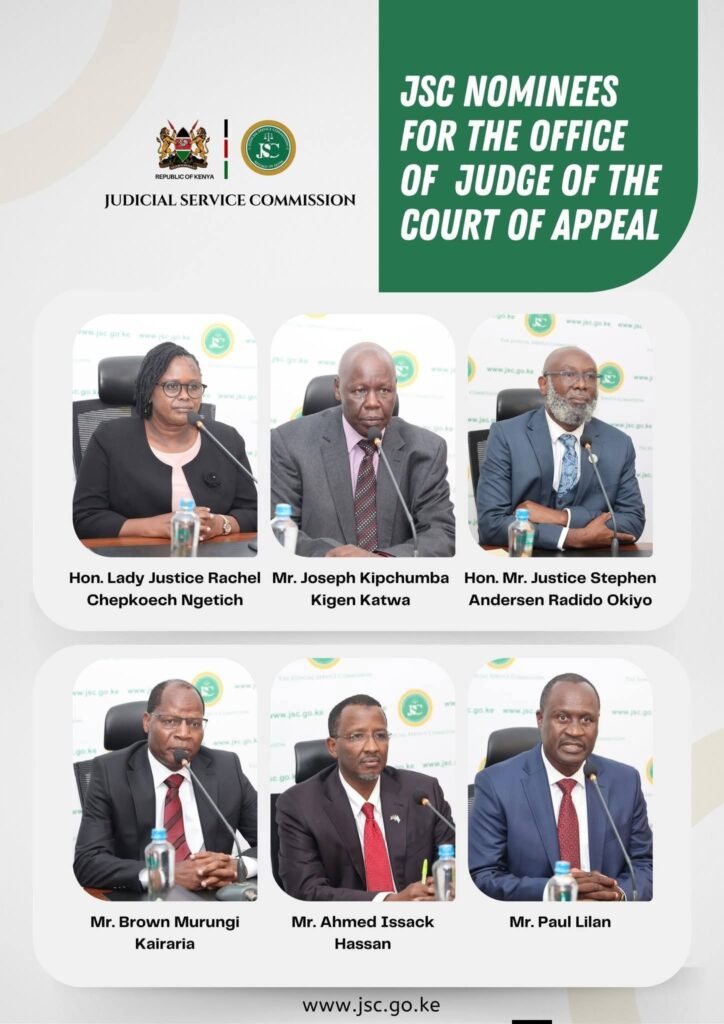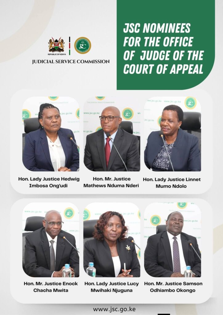 Others are High Court Judge Chacha Mwita, Lady Justice Hedwig Imbosa Ong’udi, Justice Mathews Nduma Nderi, Lady Justice Linnet Mumo Ndolo, Lady Justice Lucy Mwihaki Njuguna, Justice Samson Odhiambo Okongo and Lady Justice Rachel Chepkoech Ngetich.