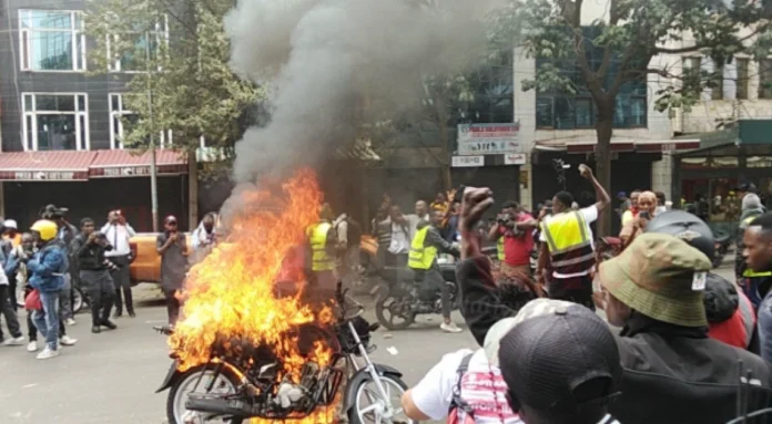 A Motorbike set ablaze in Nairobi CBD. PHOTO/ COURTESY