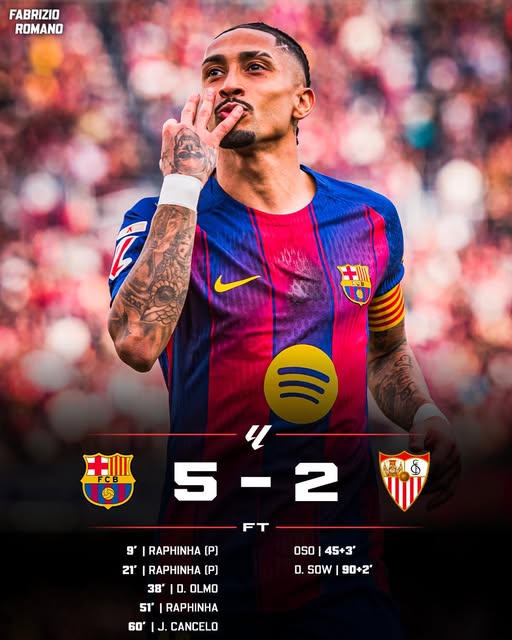 Raphinha bagged a hat-trick as Barcelona thrashed Sevilla 5-2 to restore their four-point lead at the top of La Liga on Sunday.