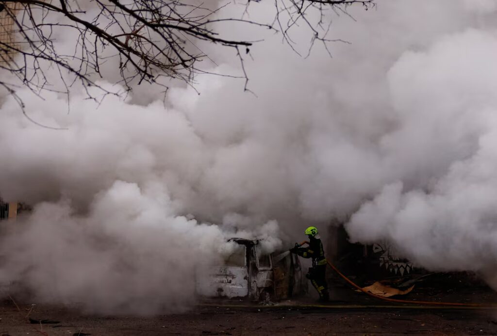 Firefighters extinguish burning vehicles, damaged during a Russian missile and drone attack on Kyiv, amid Russia’s attack on Ukraine, November 29, 2025. REUTERS/Valentyn Ogirenko