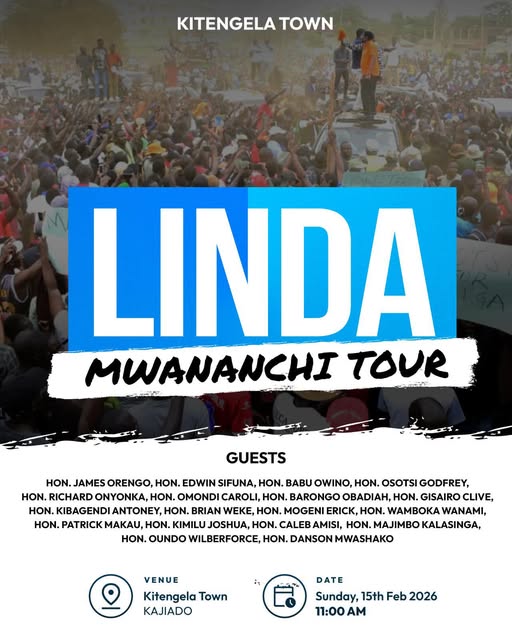 The “Linda Mwananchi” tour is scheduled to tour Kitengela Town on Sunday, February 15, and is expected to bring together several ODM lawmakers, party officials, and political commentators for public engagements and rallies.