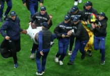 While play was halted over the disputed penalty, some supporters wearing Senegalese colours threw projectiles and others temporarily invaded the pitch before police and security staff intervened.