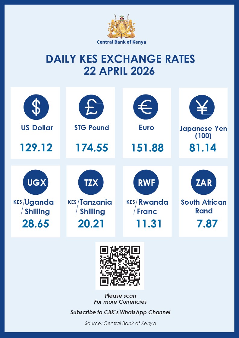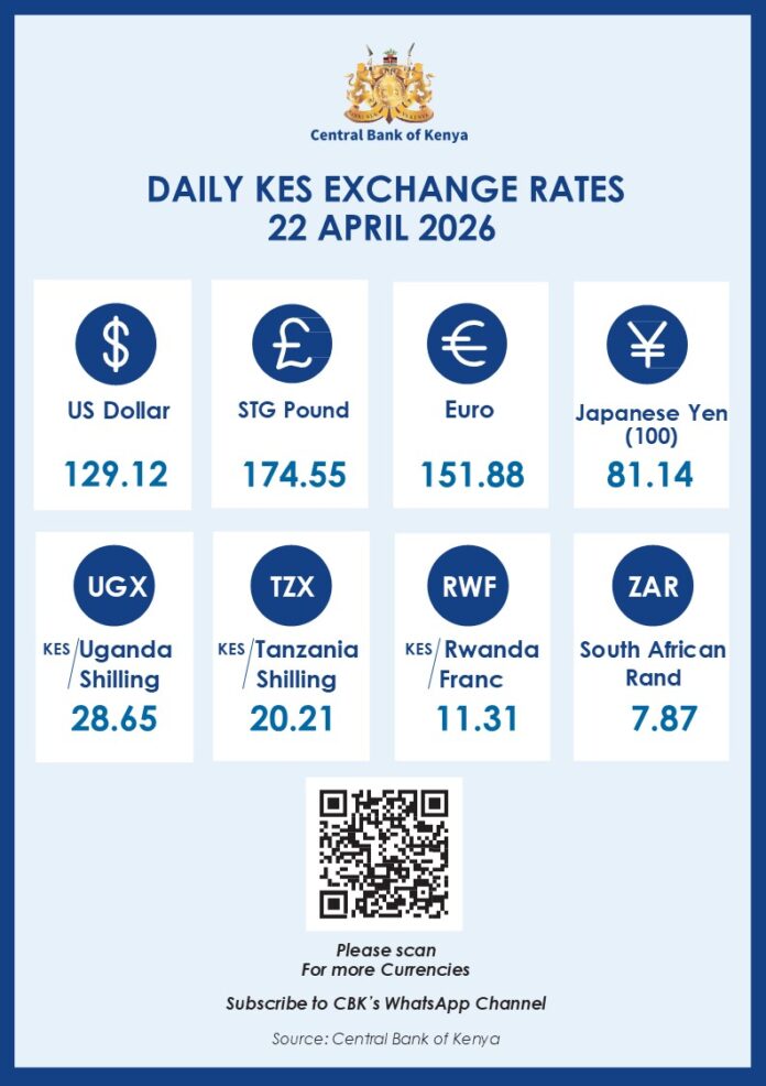 The Central Bank of Kenya has released the official daily exchange rates for April 22, 2026, showing relative stability of the Kenyan shilling against major global and regional currencies.