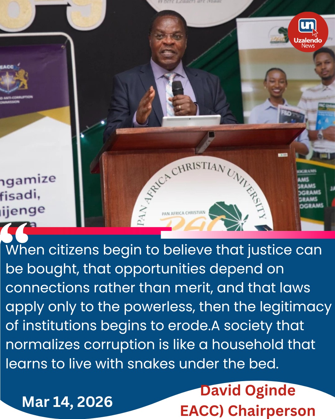 Ethics and Anti-Corruption Commission (EACC) Chairperson David Oginde has warned that corruption in society should never be accepted as normal, likening it to “a snake under the bed” that threatens the safety of the entire house.