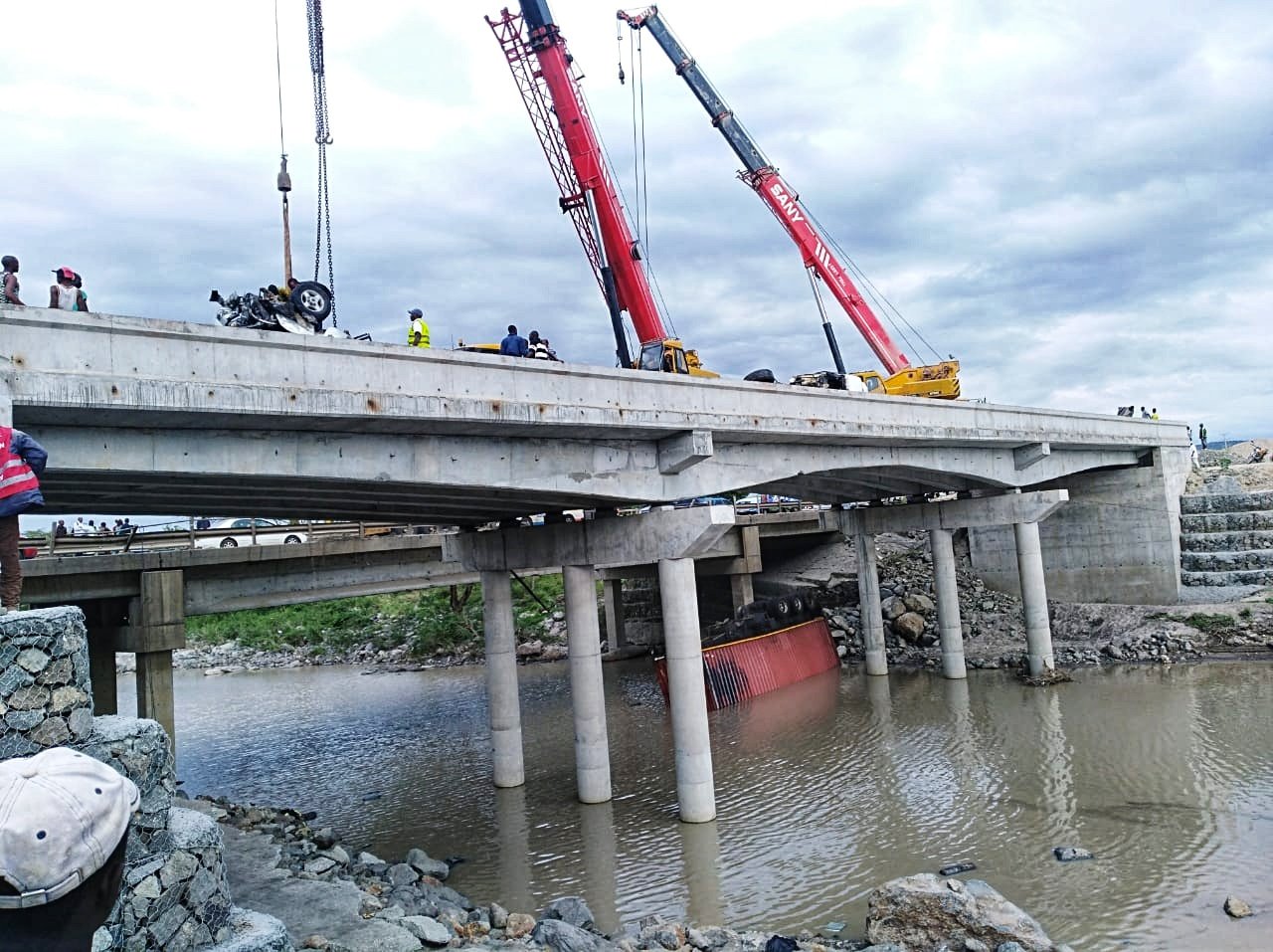 Both truck and pickup plunged into the river, with truck toppling over the pickup.