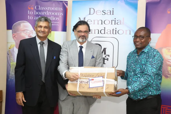L to R: Milan Shah, Chairman, Desai Foundation, Sachin Varma, CEO, Text Book Centre and Jane Mihang’o Director, Prince of Peace Educational Centre, during the hand over of Text Books and Stationery materials to 18 schools at the Desai Foundation offices as part of Text Book Centre’s 60 Schools in 60 Days CSR initiative aimed at narrowing Kenya’s educational resource gap.