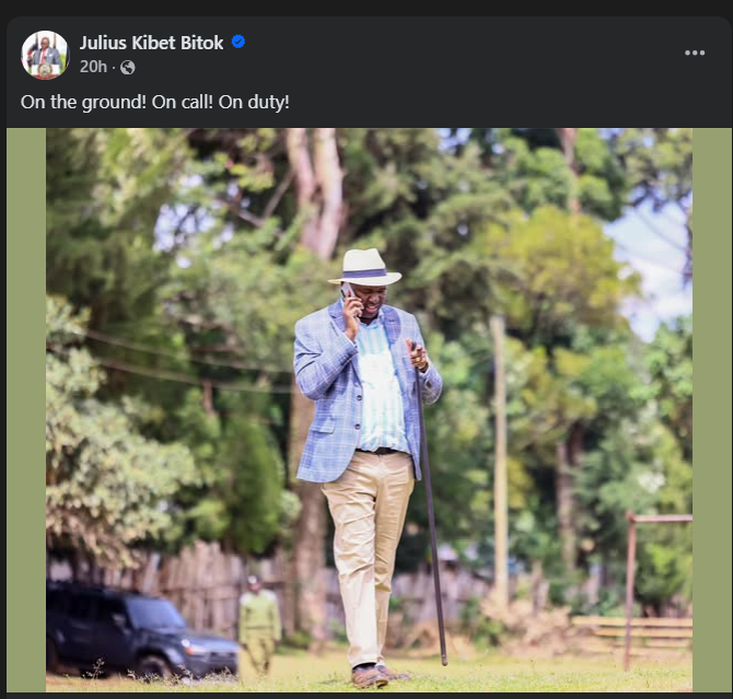 In a cheeky response to Ichung’wah’s outburst, PS Bitok posted a photo on his Facebook Page captioned ‘On the ground! On call! On duty!’