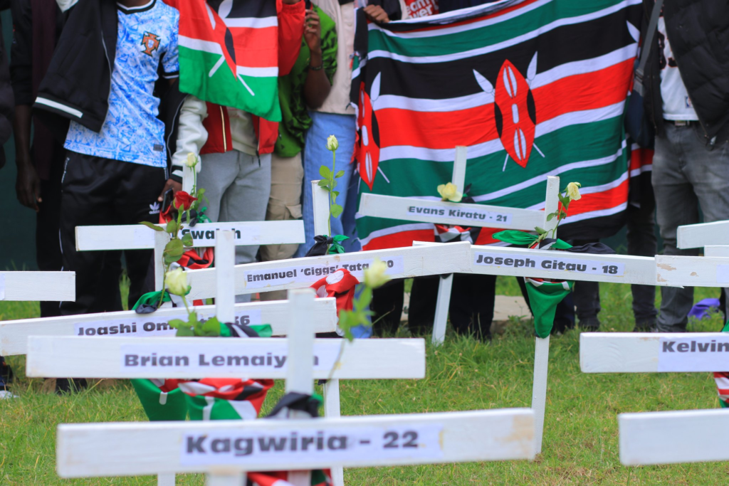 Kenyan entertainers and activists joined the crowd, rallying against bad leadership and exercising their democratic right to protest. The atmosphere was somber, with makeshift crosses bearing the names of the victims adorned with the Kenyan flag.