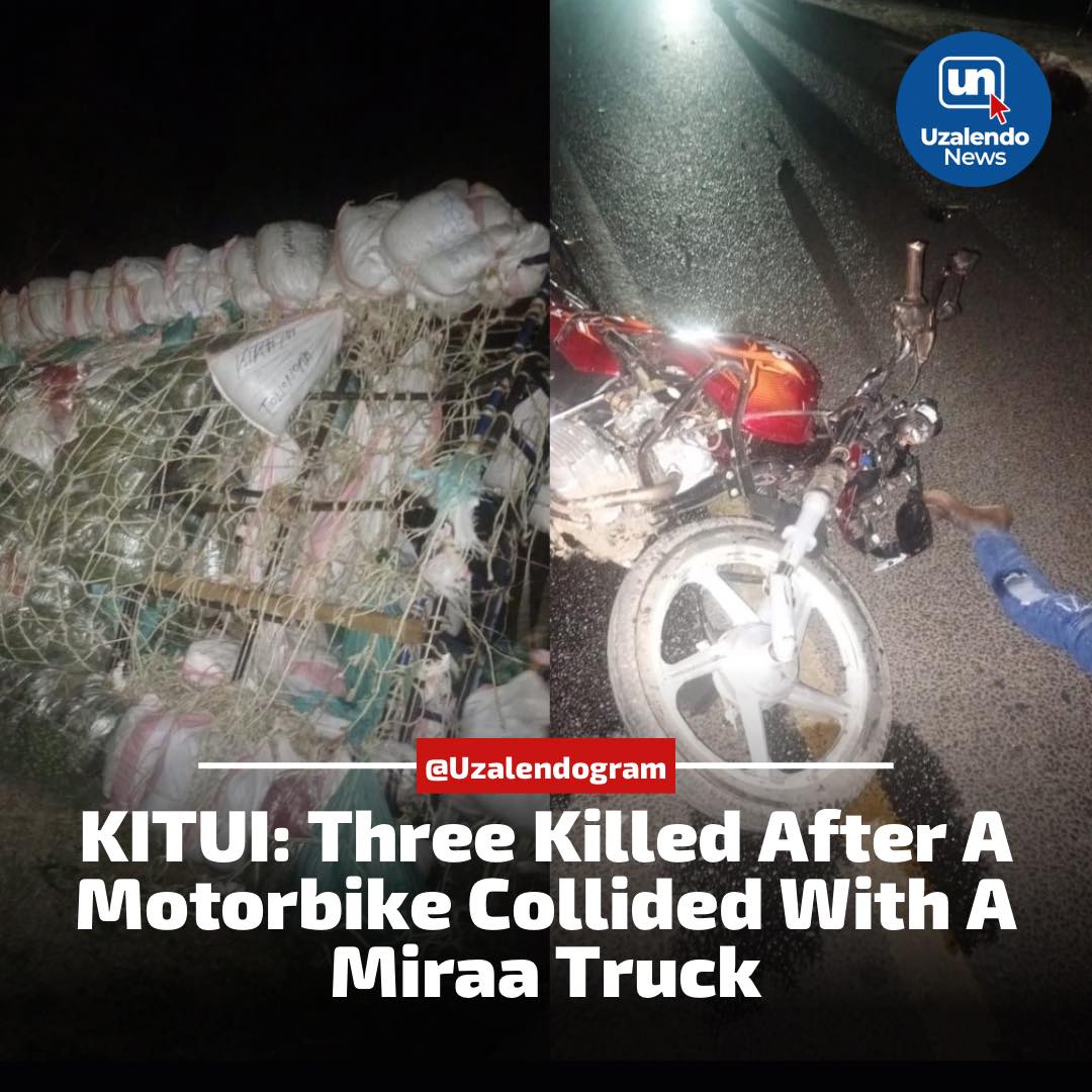 Three people died on Saturday night after a motorbike they were riding collided head on with a truck ferrying miraa at Kabati market, few kilometers from Kitui town.