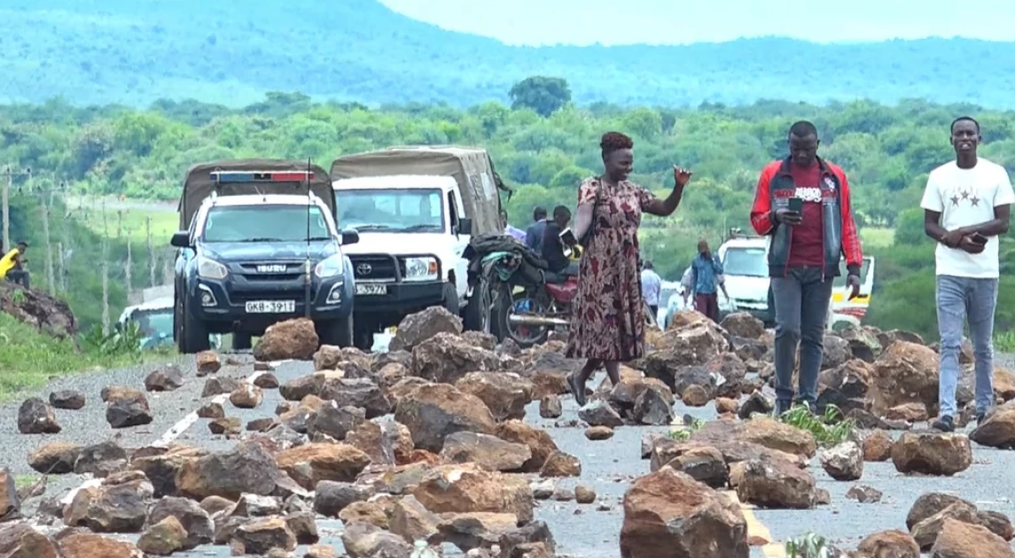 Residents in Nakuru have blocked the busy Marigat-Nakuru Highway using stones and bonfires to protest the brutal killing of two locals and the injury of two others by suspected highway robbers in an incident that occurred on April 21 at Loberrer.