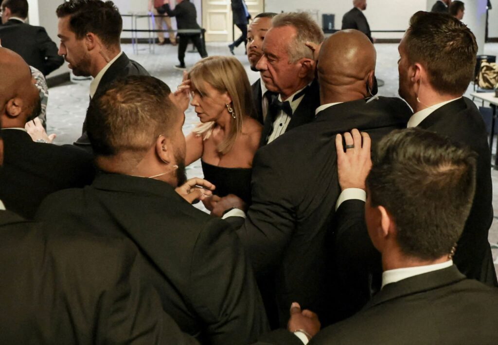The CBS reports that shortly afterwards, security rushed another guest toward the front of the room, bounding over tables and empty chairs as the guest were down on the floor.