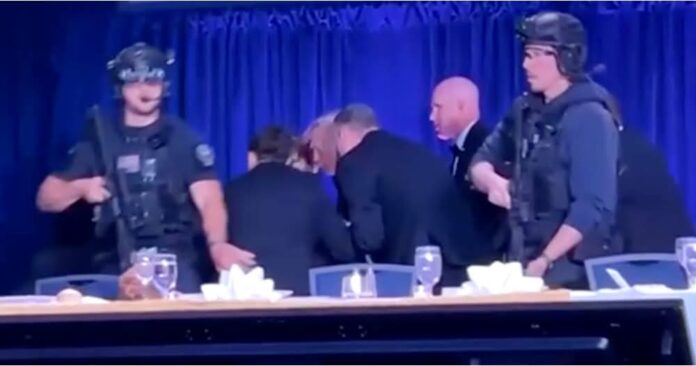 President Donald Trump was rushed from White House correspondents’ dinner after suspected gunshots heard.