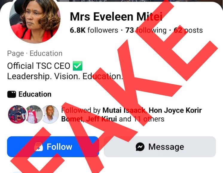 “The Teachers Service Commission (TSC) wishes to inform the public and all stakeholders that this page purporting to belong to the Acting TSC CEO Evaleen Mitei is fake and fraudulent,” the notice read.