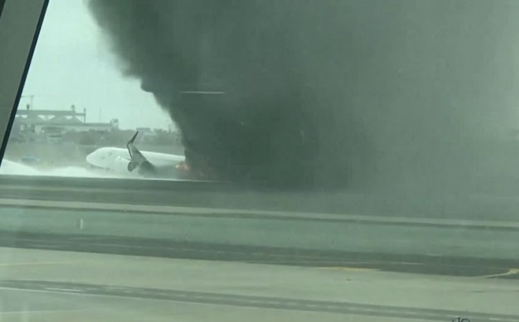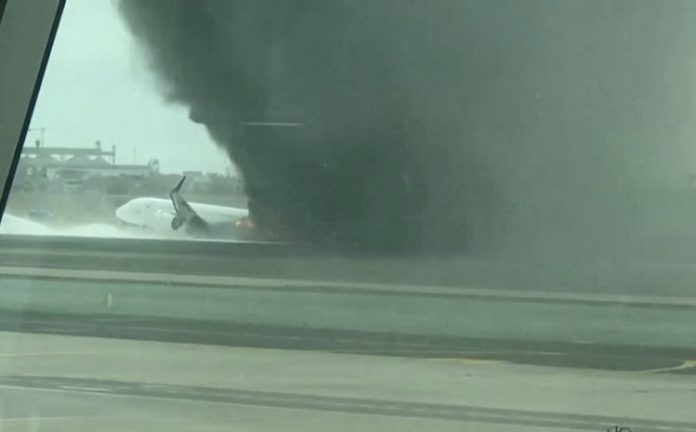 Video shared on Social media show the plane hurtling down the runway, catching fire and smoking as it comes to a stop.