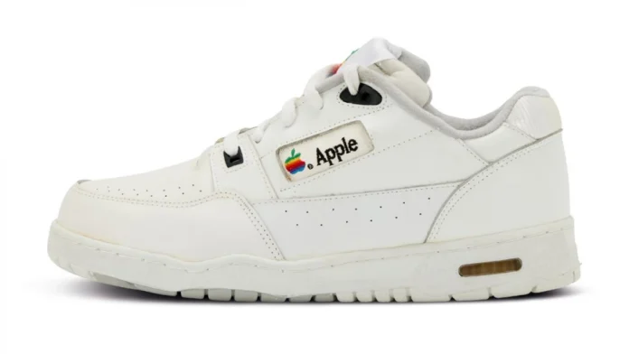 Although producing sneakers is unusual for Apple, in 1986 the tech brand released a range of clothing and accessories dubbed “The Apple Collection,” featuring mugs, umbrellas, bags, keyrings and even a sailboard, all emblazoned with the rainbow Apple logo, according to a catalog published that year. The previous year, 22,000 people bought Apple shirts from the company.