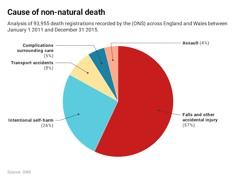 To better understand non-natural deaths, we analysed 93,955 death registrations recorded by the Office for National Statistics (ONS) across England and Wales between January 1, 2011 and December 31, 2015. We looked at each underlying cause of death to determine who had died due to “external causes of morbidity and mortality”.