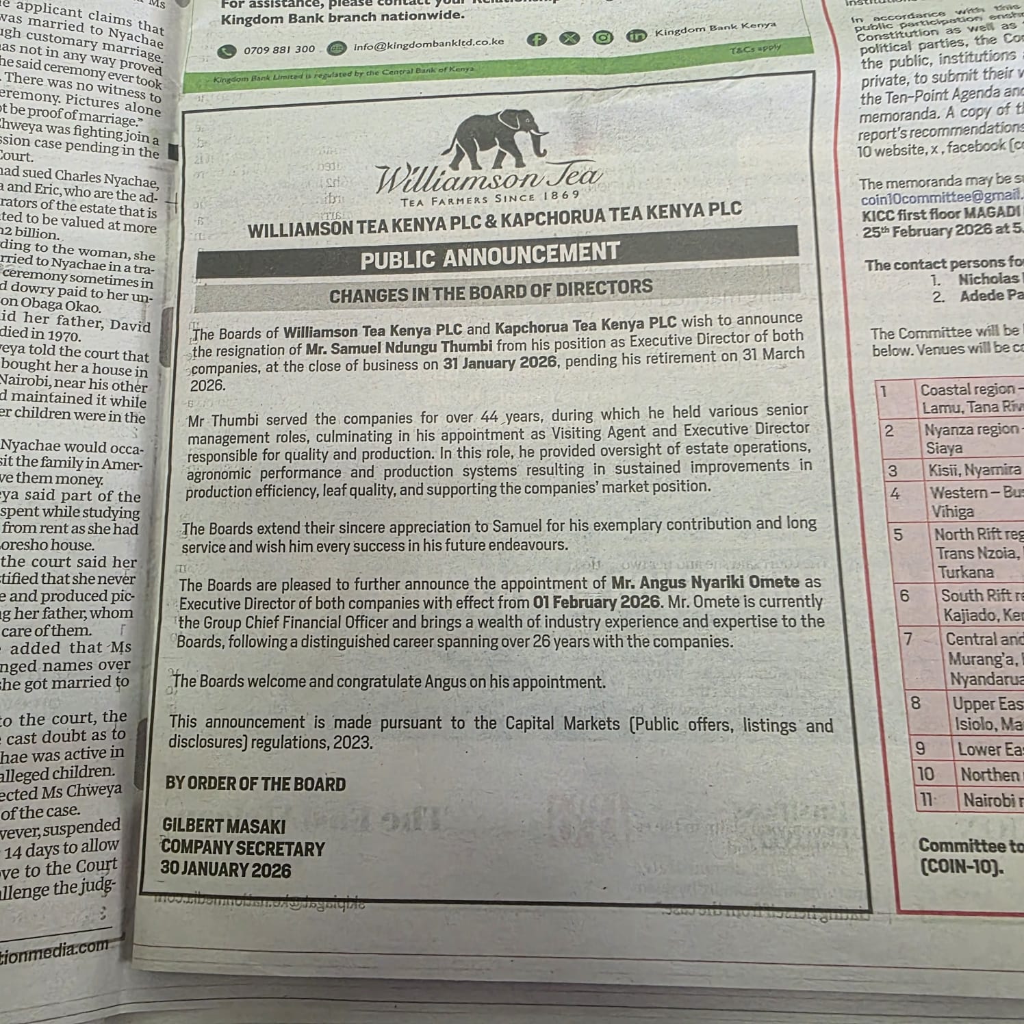 In a notice on January 30, the boards of Williamson Tea Kenya PLC and Kapchorua Tea Kenya PLC announced that Samuel Ndungu Thumbi has resigned as Executive Director of both companies, effective at the close of business on 31 January 2026.