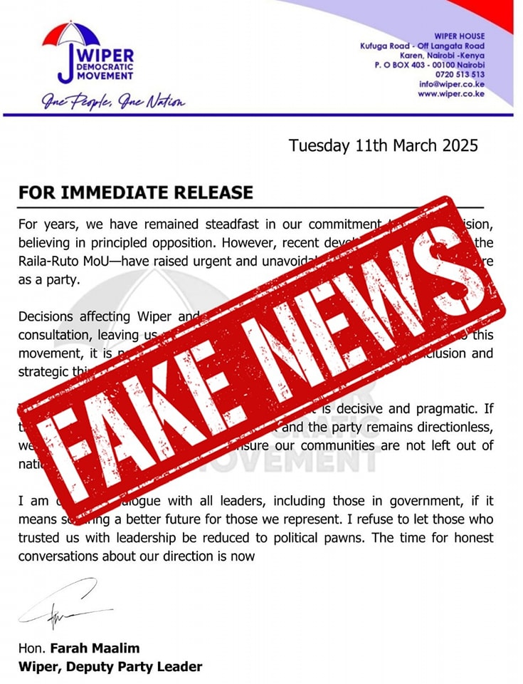 The letter, which bore the Wiper letterhead and appeared to be an official press release, has been dismissed as fake news by the party.