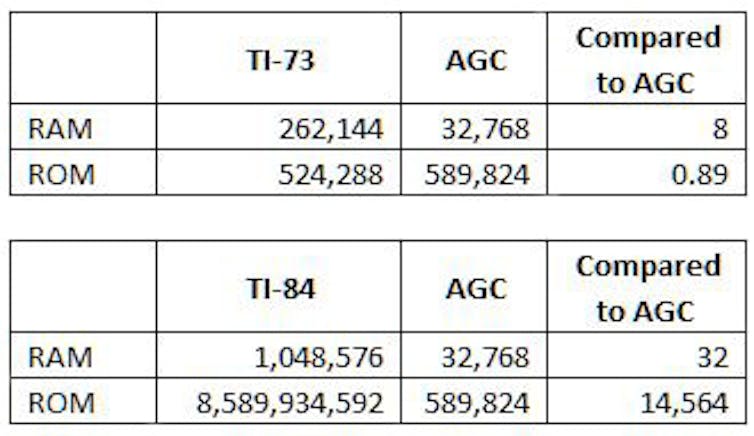 If we compare the two calculators against the Apollo guidance computer we can note that the TI-73 has slightly less ROM, but eight times more RAM. By the time the TI-84 was released, amount of RAM had increased to 32 times more than the Apollo computer and the ROM was now more than 14,500 times more.